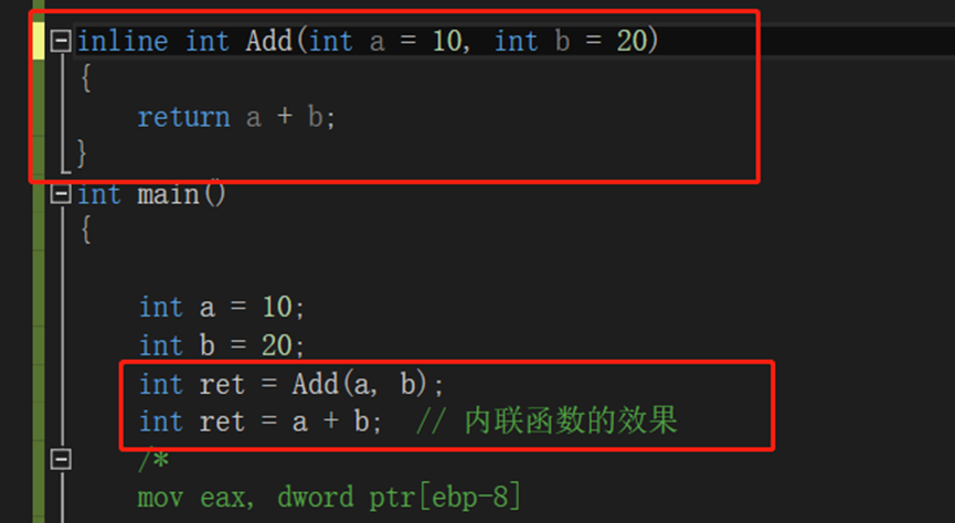 比如调用int ret = Add(a, b);调用Add函数时,这是一个标准调用,需要参数压栈,开辟Add函数栈帧,对栈帧初始化,执行函数中的指令,然后再回退到调用点,释放栈帧;而inline内联函数省去了函数调用开销,在函数的调用点,直接把函数的代码进行展开。