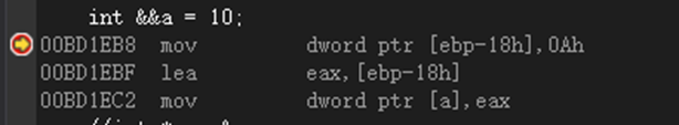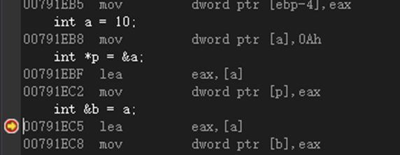 - 定义一个引用变量和定义一个指针变量,其汇编指令一模一样,如下图所示。