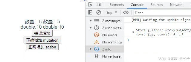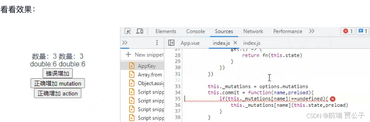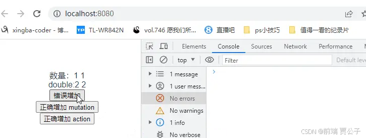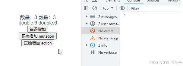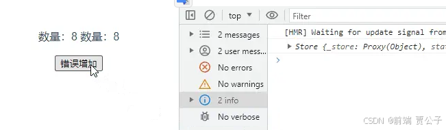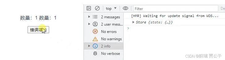点击错误增加按钮,改变 $store.state.count 的值进而导致 getters 值的变化
