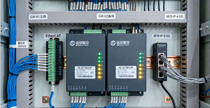 经技术选型,采用远创智控 YC-ECTM-EIP 网关作为协议转换 中枢,构建 "EtherCAT 编码器 - 网关 - EtherNet/IP 工控机" 的一体化通讯架构,解决协议异构问题,实现数据双向交互与产线协同控制。