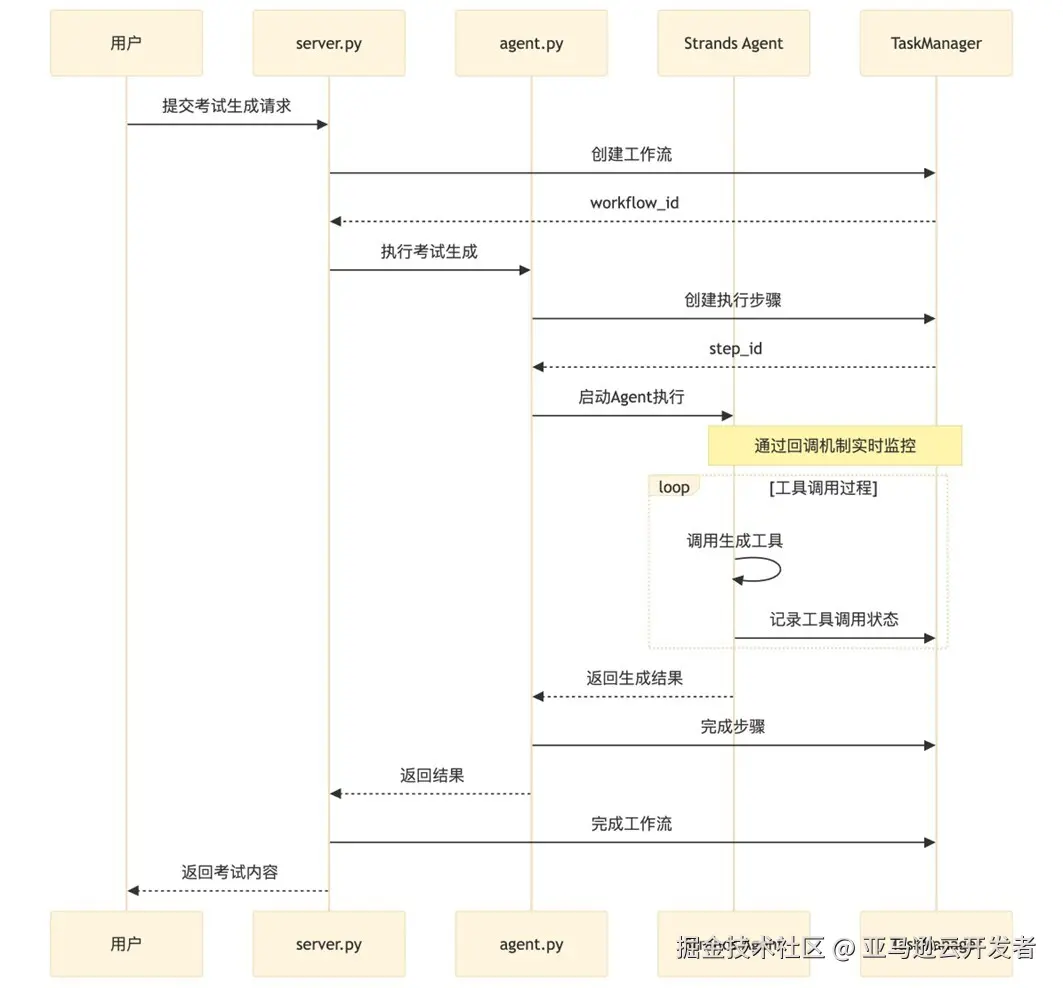 本项目基于Strands Agent框架的AI考试生成器项目成功实现了从传统手工出题到智能化自动生成的转变,将考试生成时间从小时级压缩至分钟级。项目在技术上将Strands Agent框架应用于教育领域,构建了完整的8种工具函数生成链,同时也设计了TaskManager任务评估体系,通过"工作流-步骤-工具调用"三层次架构实现了对Agent执行过程的全方位监控管理,实现了多工具协同场景下的状态跟踪和性能评估。并结合QuickSight可视化分析平台,将Agent执行数据转化为直观的性能报告和优化建议,为复杂AI系统的可观测性和可维护性提供了完整解决方案。