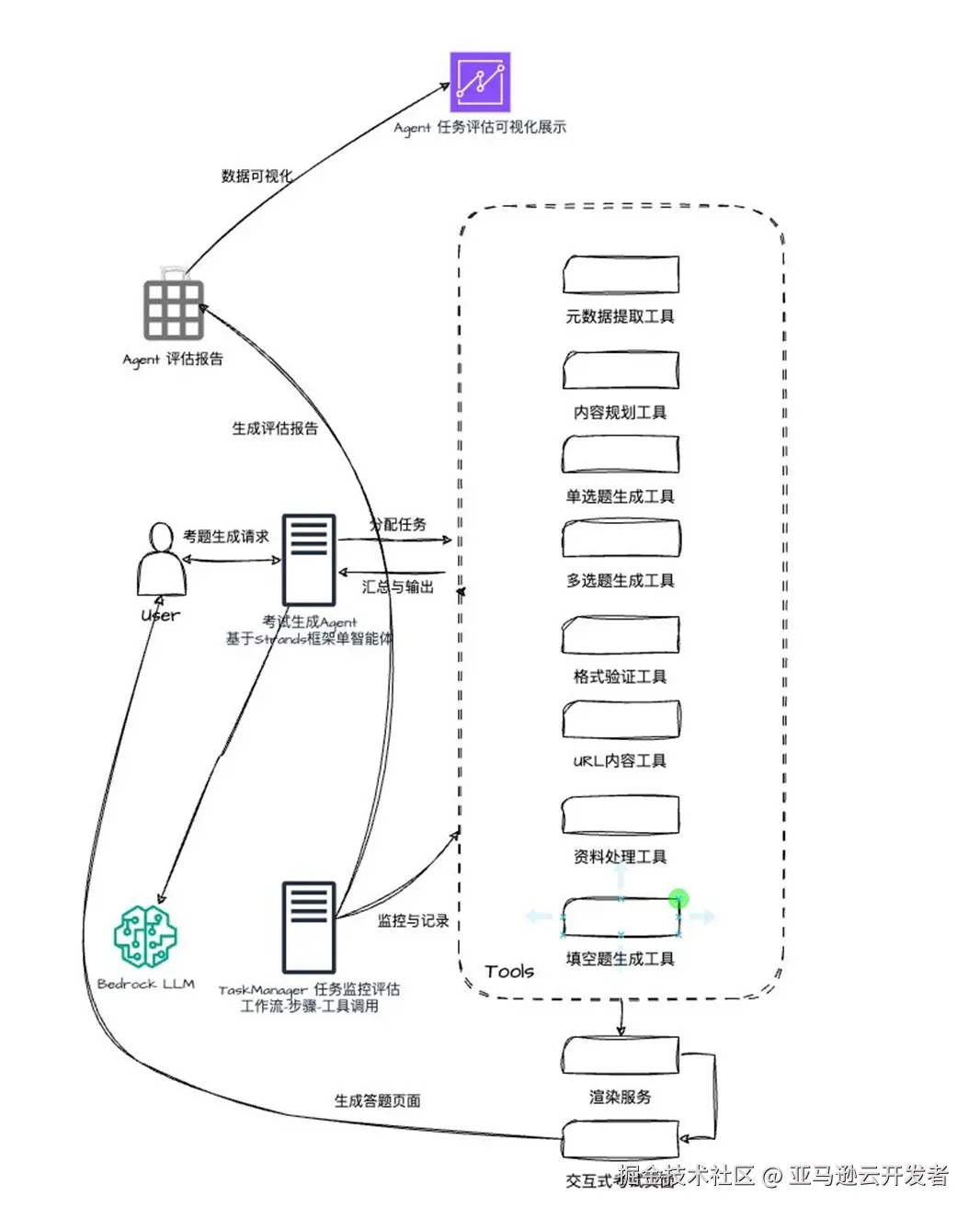 在教育领域,考试(一年级-高三年级,数学/科学/英语/历史等多学科)作为评估学生学习成果的核心手段,其传统生成方式长期存在诸多痛点:时间成本高昂、质量稳定性不足、题型覆盖局限、迭代效率低下等问题。为解决这些问题,我们开发了基于 Strands Agent 框架的 AI 考试生成项目。该项目依托大语言模型的强大能力实现考试内容自动化生成,核心目标包括将原本小时级的工作量压缩至分钟级、确保考题质量与难度符合预期标准、支持多种题型和难度以适配不同教学场景、能基于参考资料生成考题以提升针对性和实用性。