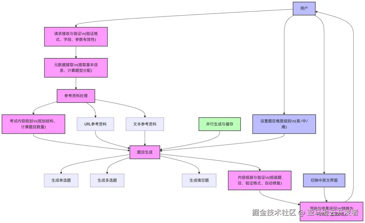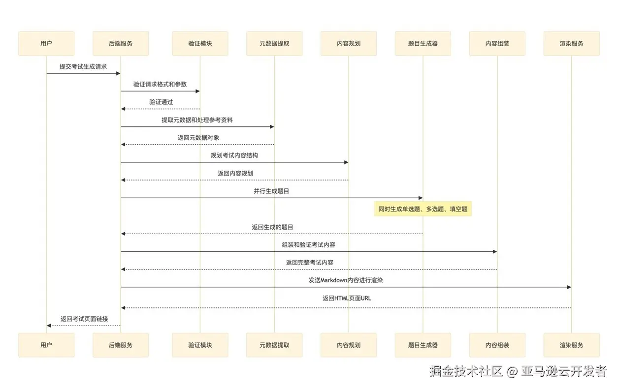 AI考试生成器采用模块化的时序处理架构,通过各组件间的有序协作实现自动化考试生成。