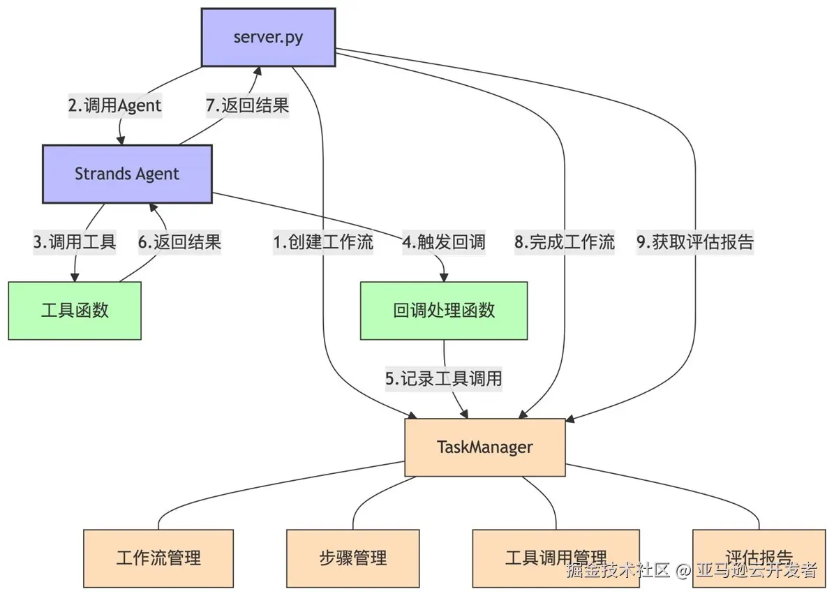 Agent执行评估工作流(Taskmanager)是基于 Strands Agent 框架的回调机制构建、负责工作流与工具调用的状态监控和管理。回调机制提供的事件监听接口允许 TaskManager 捕获 Agent 运行过程中的状态变更事件,特别是工具调用的执行状态转换。TaskManager 实现了以下核心功能: