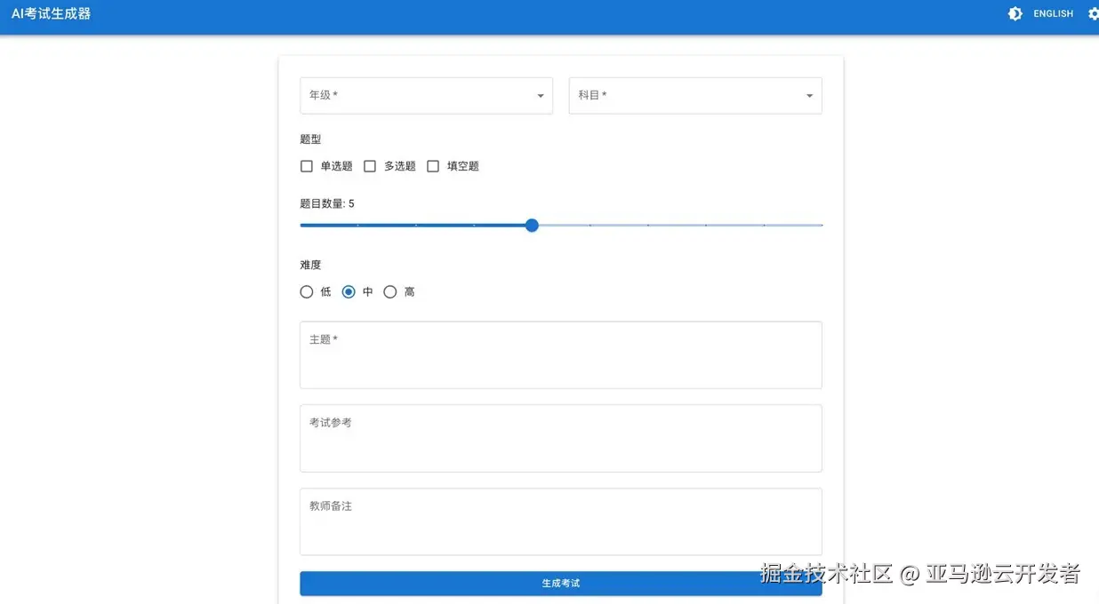 项目的技术实现涵盖后端架构、前端构建、数据处理及其他支撑技术,各部分协同保障系统运行。后端基于 Strands Agent 框架搭建,该框架提供 Agent 基础能力,负责协调各类工具的调用;采用 Flask 作为 Web 框架,承担 HTTP 服务及页面渲染相关工作;开发语言主要采用 Python;大语言模型能力由 亚马逊云科技 Bedrock(Claude 模型)提供支持。前端部分选用 React 作为核心框架构建用户界面,结合 TypeScript 进行开发以保障类型安全;UI 组件采用 Material-UI 库;构建工具使用 Vite。数据处理环节通过缓存机制基于本地文件实现;多任务的并行生成通过 ThreadPoolExecutor 完成。Markdown 被用作考试内容的中间格式;HTML、CSS 与 JavaScript 共同支撑交互式考试页面的渲染及交互功能实现。