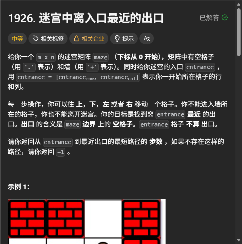 单源bfs,从一个固定的点开始向外遍历找到一个离自己最近的点,而当他向外遍历时,第一次碰到了满足要求的点,那么这时这一条路就是最近的,对应到这道题就是从entrance遍历到边界的最近的出口,而为什么第一次bfs到他就是最近的?