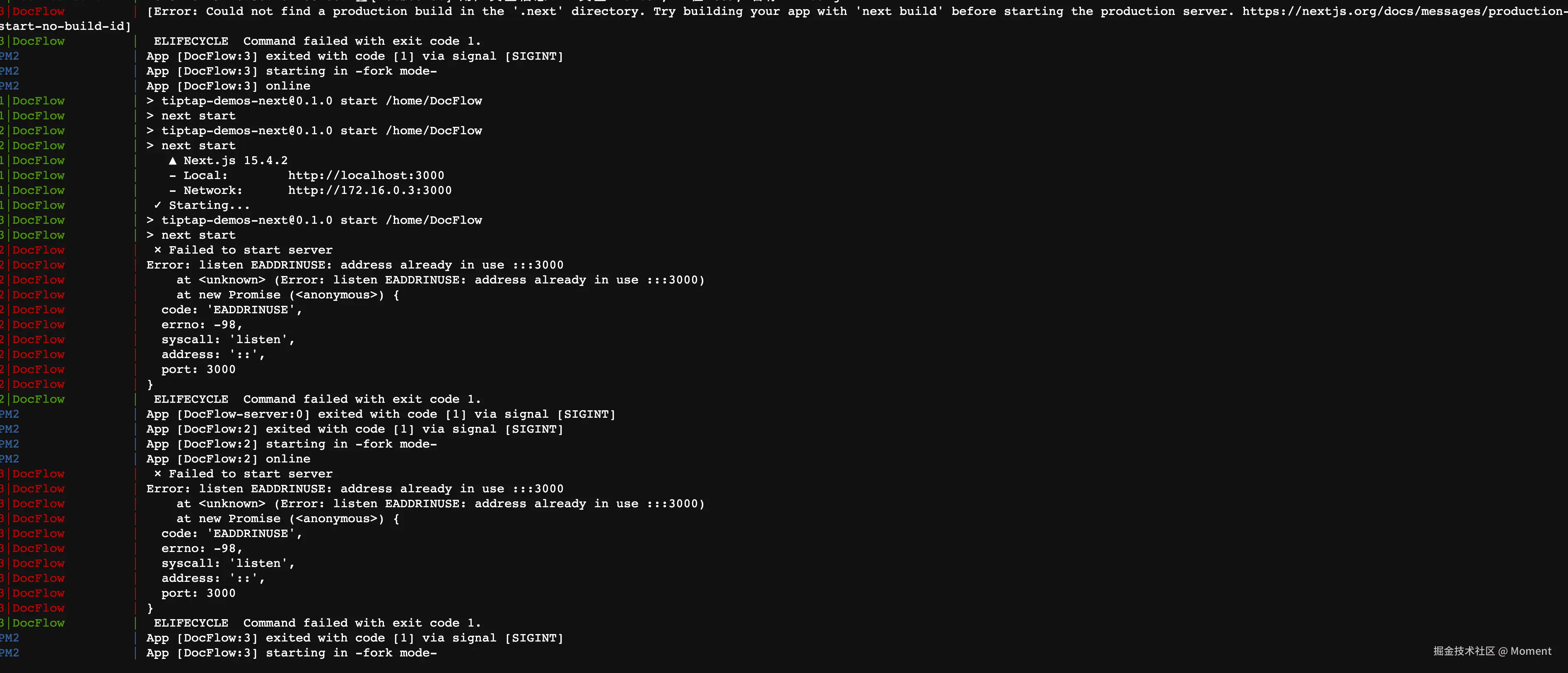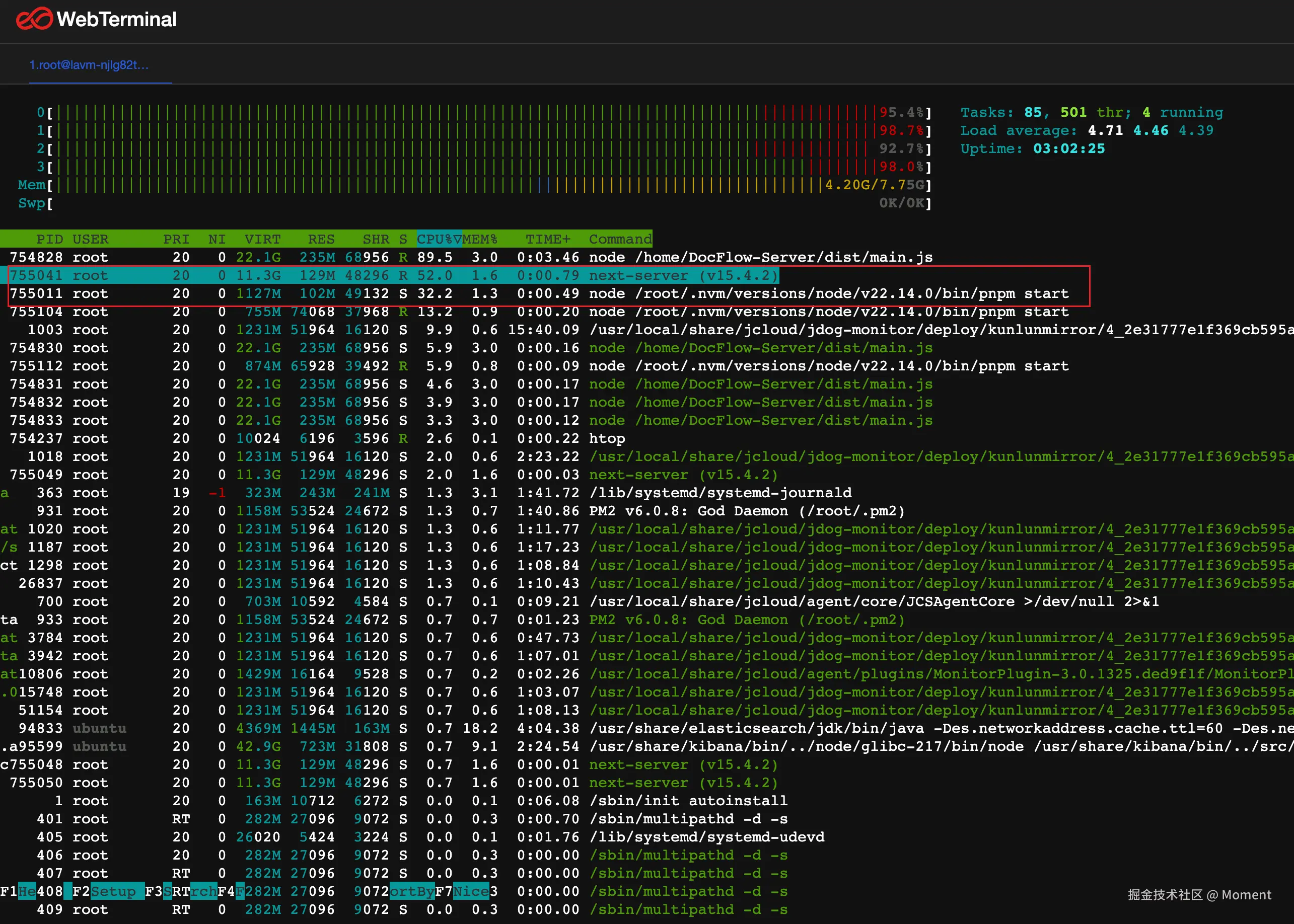 原来是 next-server 和 node(运行在 /home/DocFlow-Server/dist/main.js)占用了基本全部的 CPU,那这个原因就很清楚了,那么接下来就可以排查了这个问题的原因了。