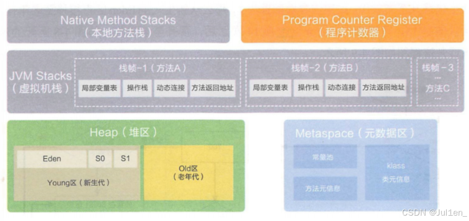 程序计数器吗? 它只记录了一个数字,不需要。栈?内存会随着栈帧的销毁而自动释放,不需要。元数据区?类对象通常只需要加载,不需要卸载,所以也不需要。