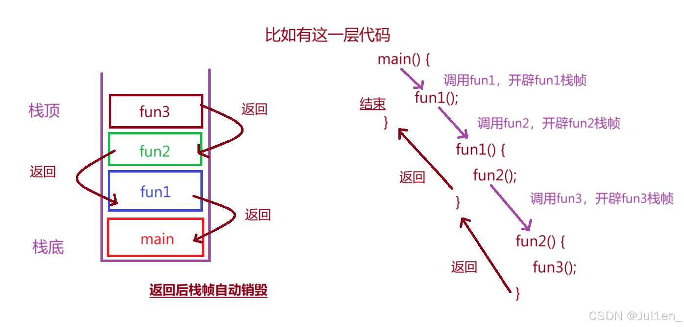 这里的栈也是 "后进先出" 的结构,维护了方法调用的关系,每调用一次方法就开辟一个栈帧,方法执行完就自动消除(底层是main方法------Java的方法入口从main开始)