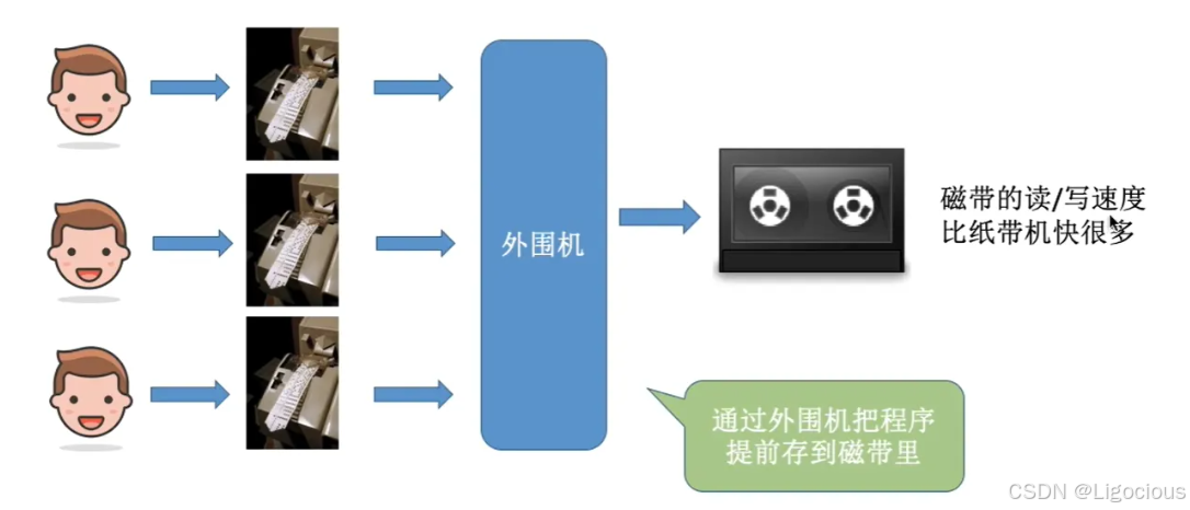 可以看到这时的编程不再是一个人进行的了,程序员们将计算机要执行的指令全部输入到外围机,外围机有把程序提前存入磁带中,而计算机从磁带中读/写的数据的速度比从纸带机上更快。