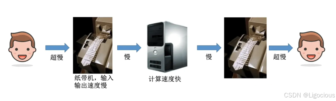 从图上可以看到,由程序员通过纸袋上打孔进行编程 (有无孔表示1和0,组合的二进制序列是机器可以识别的信息),在这一过程中编程的效率低,计算机读取并输入数据的效率也很低,总之就是输入输出效率低,但是计算机计算的速度快。因此该阶段的操作系统存在很大缺点,我们进行了归纳: