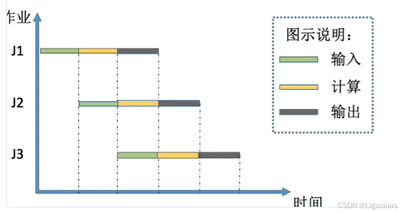也就是在运行第一道程序,指令处理时,进行下一道程序数据的输入;第一道程序数据输出时,进行第二道程序,指令处理,由此,同时干许多事,提高其效率。