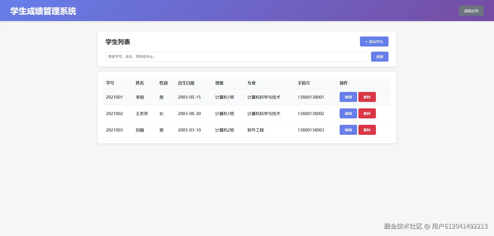 - ✅ 查询学生信息(支持学号、姓名、班级、专业搜索)