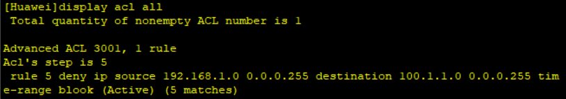 rule deny source 192.168.1.0 0.0.0.255 destination 100.1.1.0 0.0.0.255 time-range bl00k # 禁止来自192.168.1.0/24网段的流量去到100.1.1.0/24网段,在规定的时间内