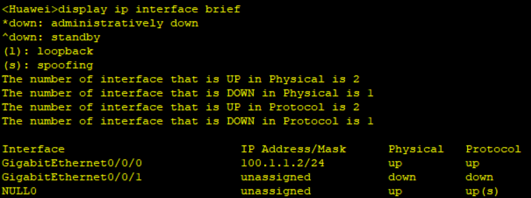 ip address 100.1.1.2 24 #将其IP地址配置为100.1.1.2/24