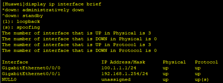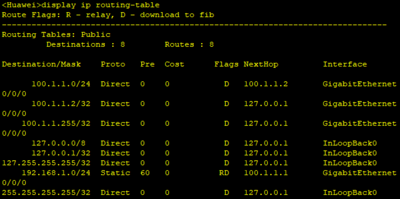 ip route-static 192.168.1.0 255.255.255.0 100.1.1.1 # 记录去到192.168.1.0网段的下一跳是100.1.1.1,实现跨网段通信。