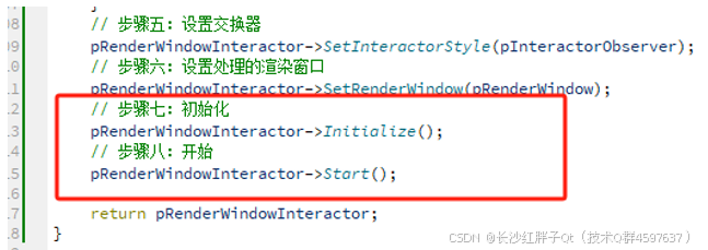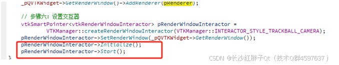 - 初始化交互器:将交互器绑定到渲染窗口(SetRenderWindow()),并设置交互样式(SetInteractorStyle())。