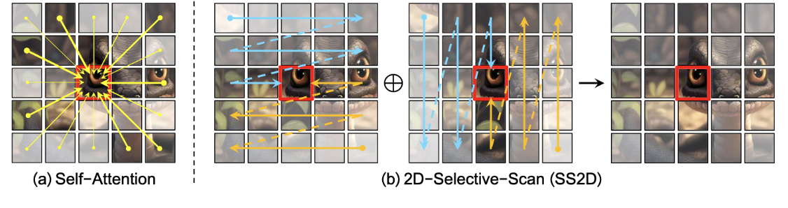引入SS2D桥接一维阵列扫描和二维平面遍历,从而能够扩展选择性SSM处理视觉数据