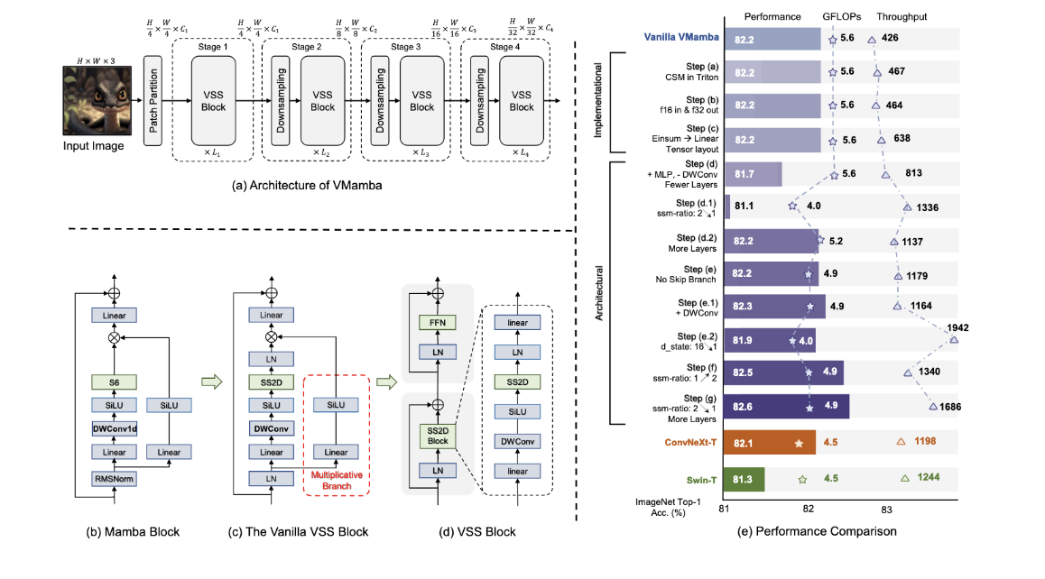 核心是带有2D选择性扫描模块的可视状态空间(VSS)块的堆栈,通过四条扫描线路的遍历,SS2D弥合了一维选择性扫描的有序性质与二维视觉数据的非循序结构之间的差距,并有助于从各种来源和角度收集上下文信息,基于VSS块开发了VMamba架构,并通过一系列架构和实现增强加速他们