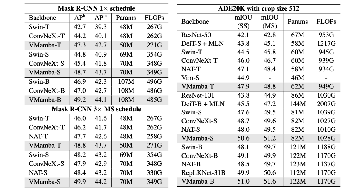 在语义分割上,VMamba-T 在单尺度 (SS) 设置中实现了 3.4% 高于 Swin-T 和 1.9% ConvNeXt-T 的 mIoU,并且在多尺度 (MS) 输入中优势仍然存在。对于小型和基础级别的模型,VMamba-S/B 在 SS 设置中优于 2.6% NAT-S 2.5% /B [25] / mIoU,在 MS 设置中优于 1.7% / 1.9% mIoU。