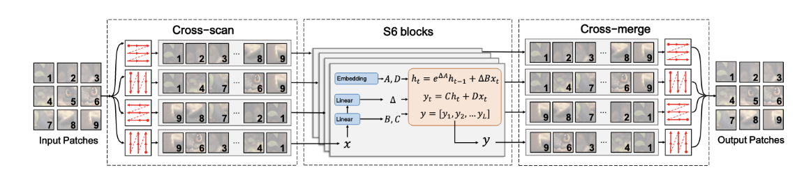 SS2D包括三个步骤,交叉扫描,选择性扫描和交叉合并
