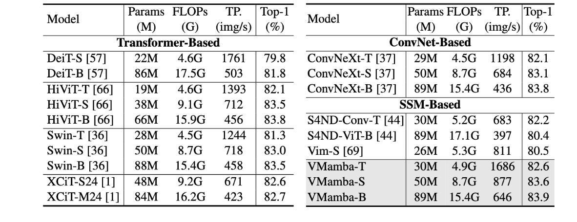 在FLOP中,VMamba-T达到了82.6%的Top-1,优于 DeiT-S 2.8% 和 1.3% Swin-T。值得注意的是,VMamba 在小型和基本规模上都保持了其性能优势。例如,VMamba-B 的 top-1 精度超过 83.9% DeiT-B 2.1% ,超越 0.4% Swin-B。