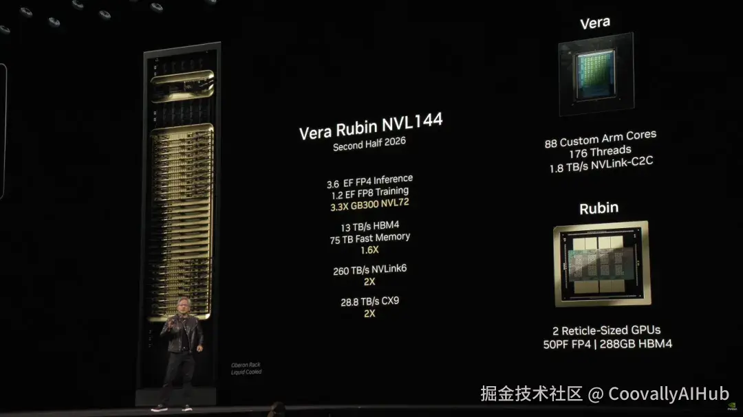 - Rubin GPU: 两颗Reticle大小芯片,FP4性能高达50 PFLOP