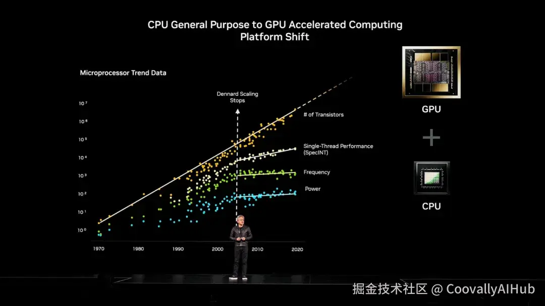黄仁勋回顾了计算架构的演变历程:"几十年来,CPU的性能增长一直如时钟般精准------直到登纳德缩放定律失效。"