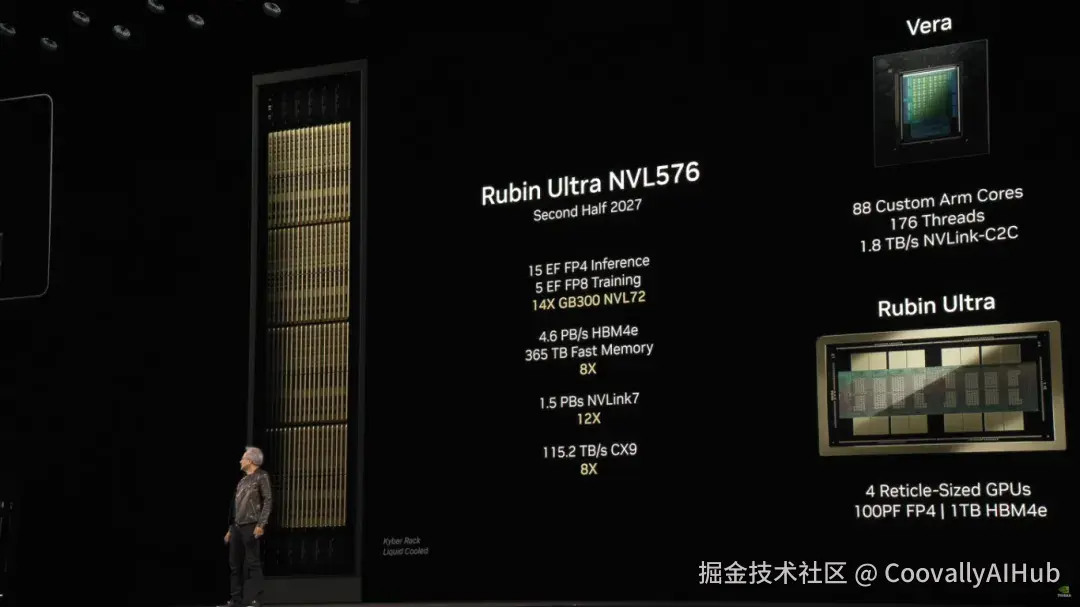 而下一代加强版------Rubin Ultra NVL576 ------计划于 2027 年登场,GPU 数量翻倍,HBM4e 内存总容量达到 1 TB,FP4 性能直飙 15 Exaflops。