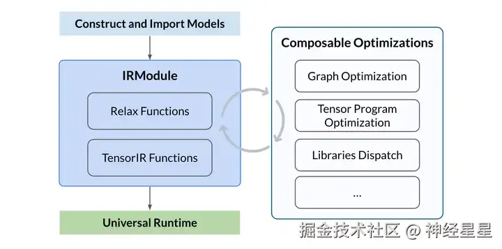 - 执行可组合优化:执行一系列优化转换,包括计算图优化、张量程序优化和算子调度/分发等