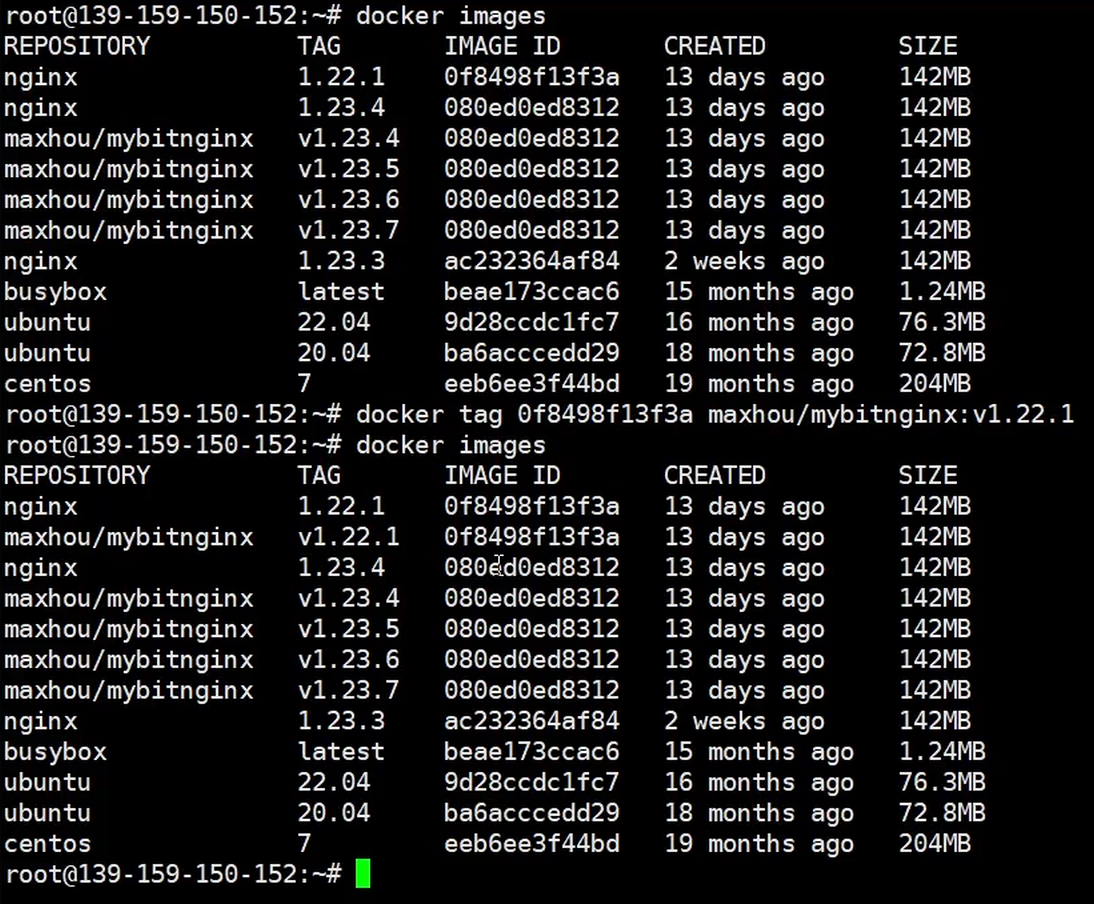 docker images查看,会发现多了一行myregistry.com/myubuntu:22.04的记录,但它的IMAGE ID与ubuntu:22.04完全相同。
