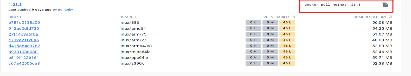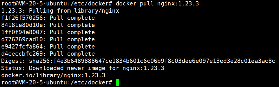 下图展示了docker pull nginx:1.23.3的执行过程。可以看到Docker正在分层下载,每一行对应一个layer。