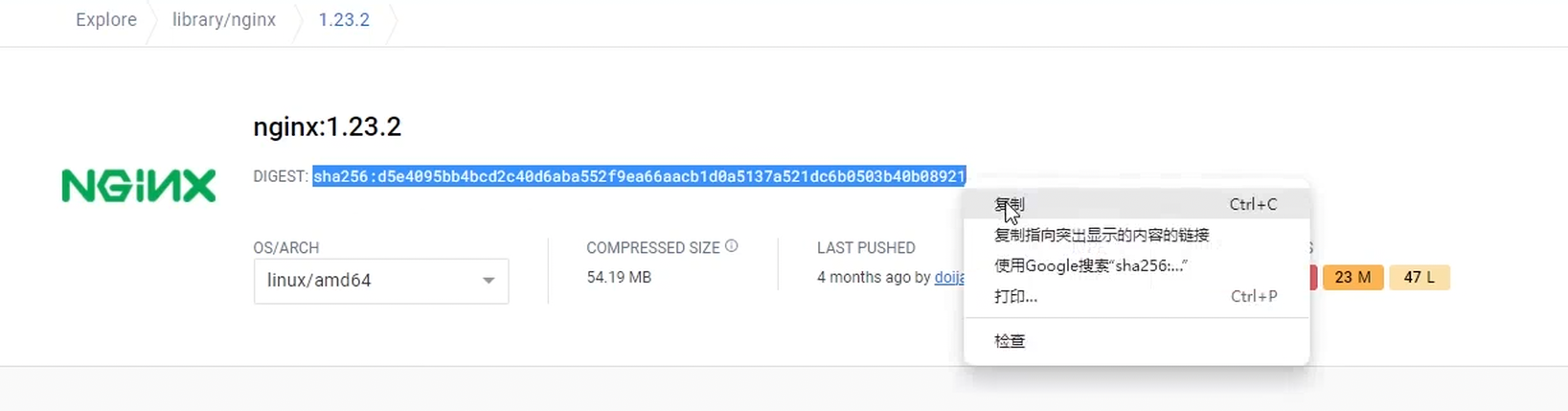ImageName:Tag的格式来唯一标识。例如,nginx:1.23.3指向Nginx的1.23.3版本镜像,而nginx:latest通常指向该Repository中最新的稳定版镜像。Tag是可变的,latest这个Tag今天可能指向版本A,明天就可以更新为指向版本B。为了实现不可变的基础设施,更可靠的方式是使用镜像的摘要(Digest),这是一个基于镜像内容生成的SHA256哈希值,是镜像唯一的、不可变的ID。 -