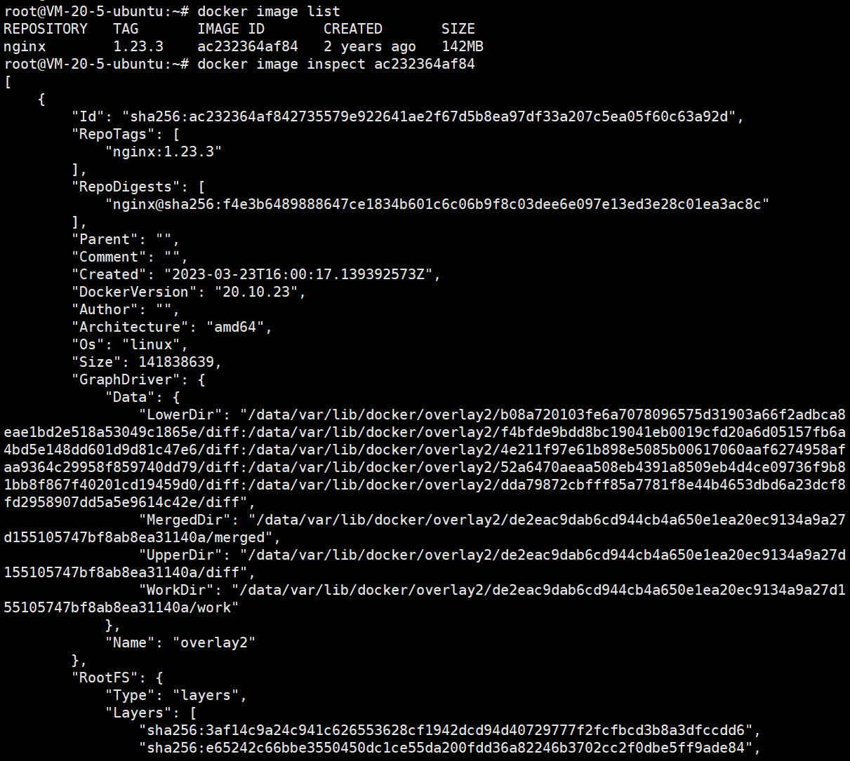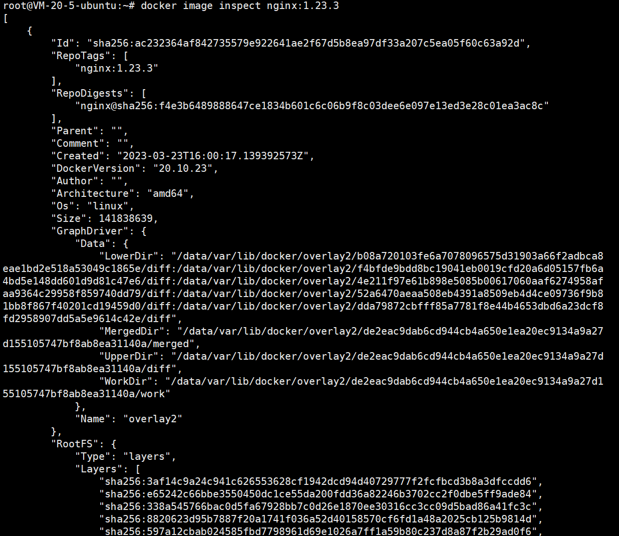 输出会包含镜像的ID、标签、创建时间、架构、环境变量、暴露的端口、启动命令、所有层的摘要等海量信息。