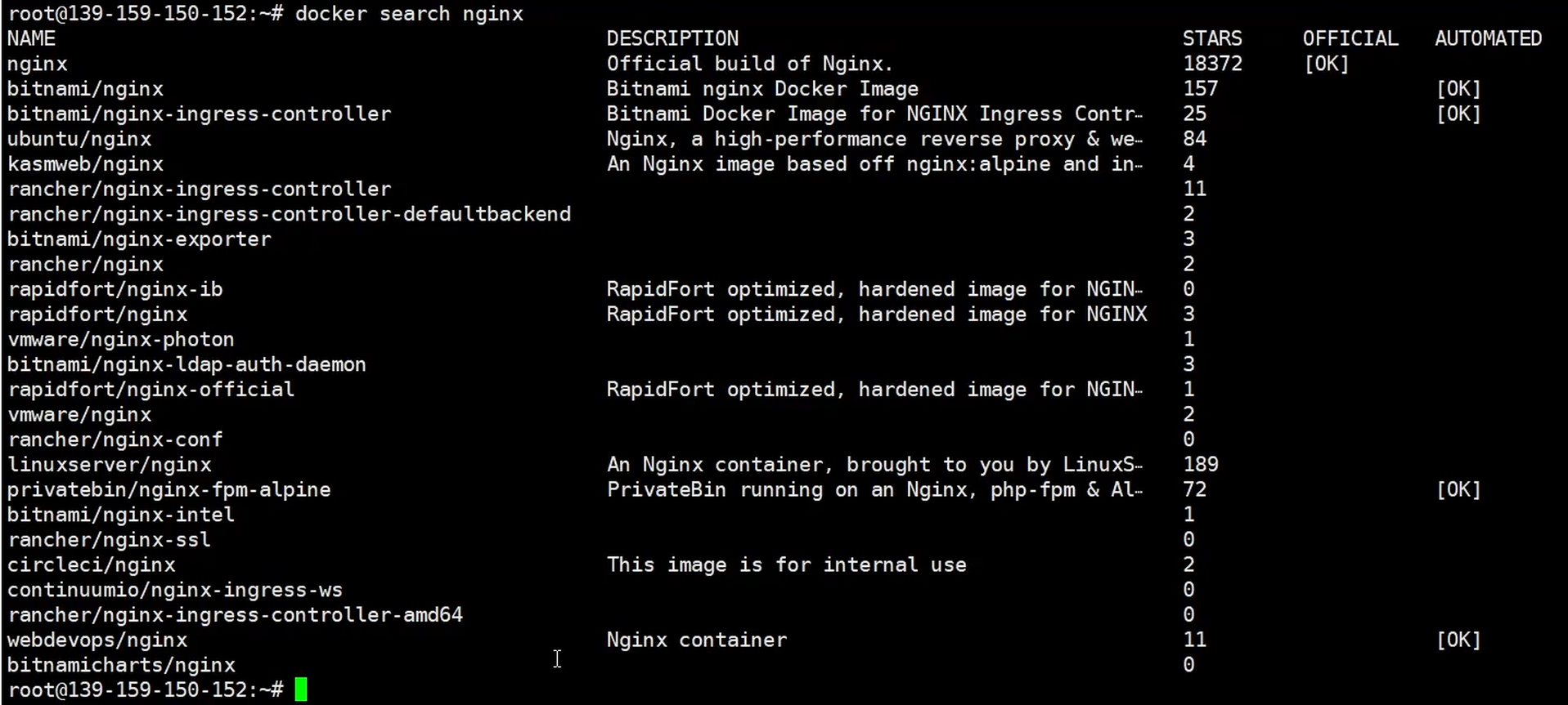 --no-trunc: 显示完整的镜像描述。-f,--filter: 根据条件进行过滤,如stars=10表示过滤出星级不小于10的镜像。