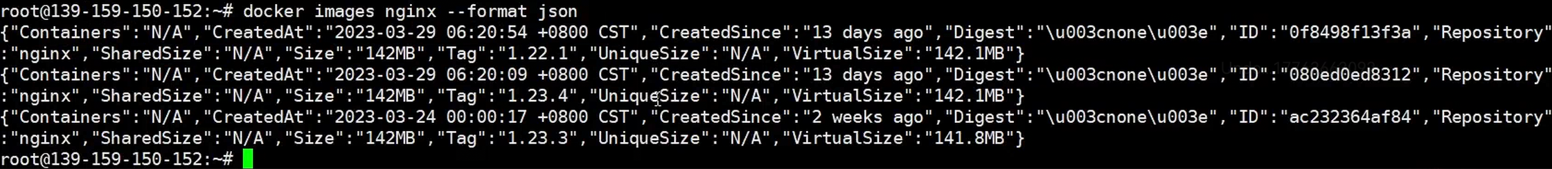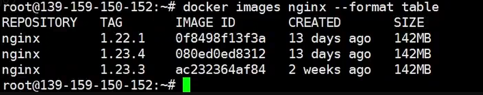 bash# 以表格格式输出,并自定义列 docker images nginx --format "table {{.ID}}\t{{.Repository}}\t{{.Tag}}"