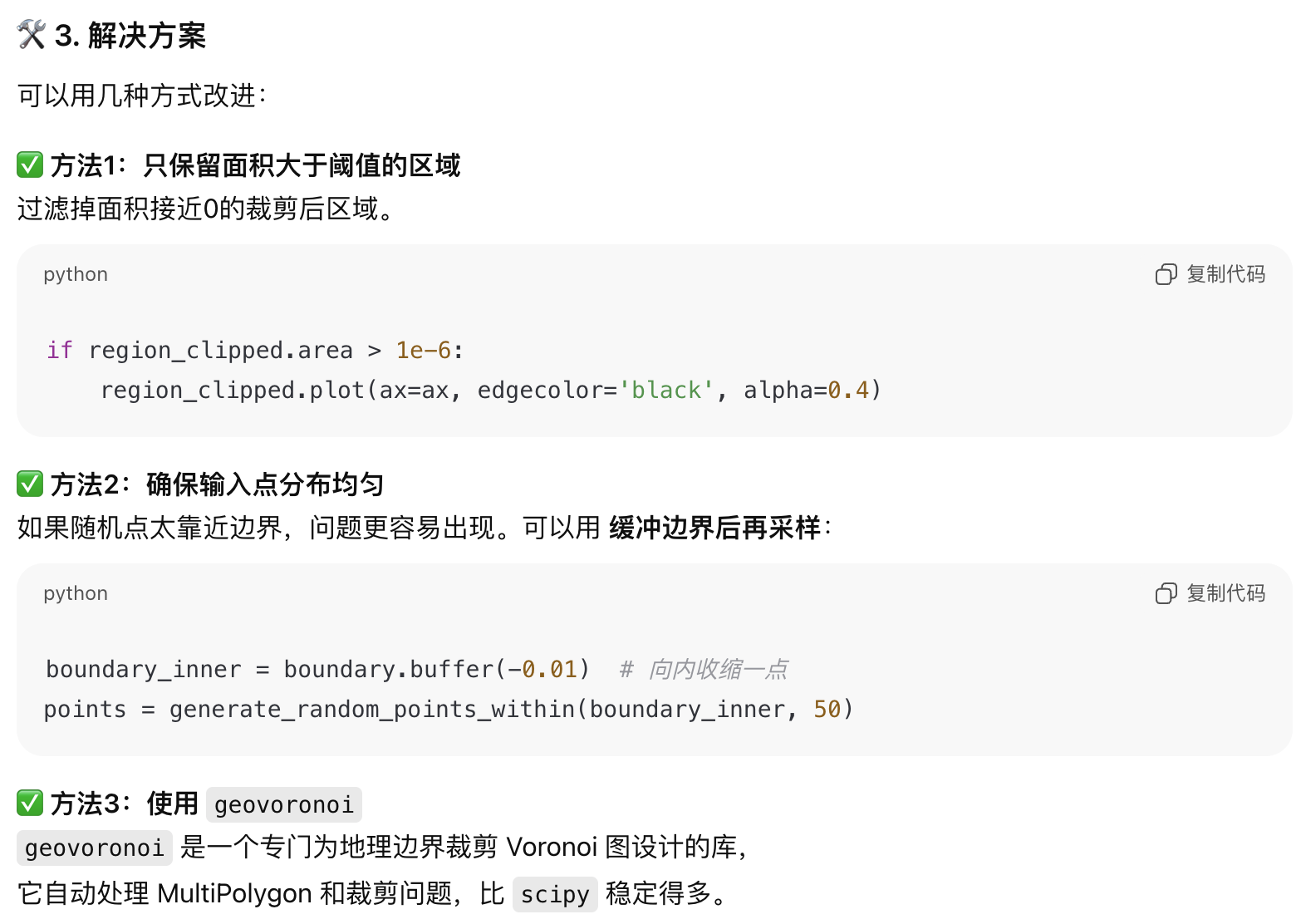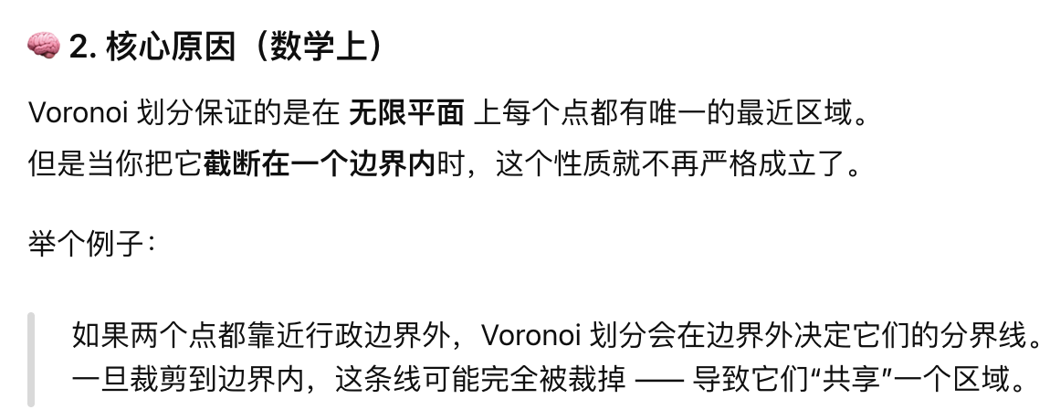 可能是因为我用的是实际的地图数据,边界比较复杂,用这个库老是会有很多小bug,比如边缘会有部分面积没有被划入任何一块区域。和AI对话了好多轮,还是没有完全搞定。