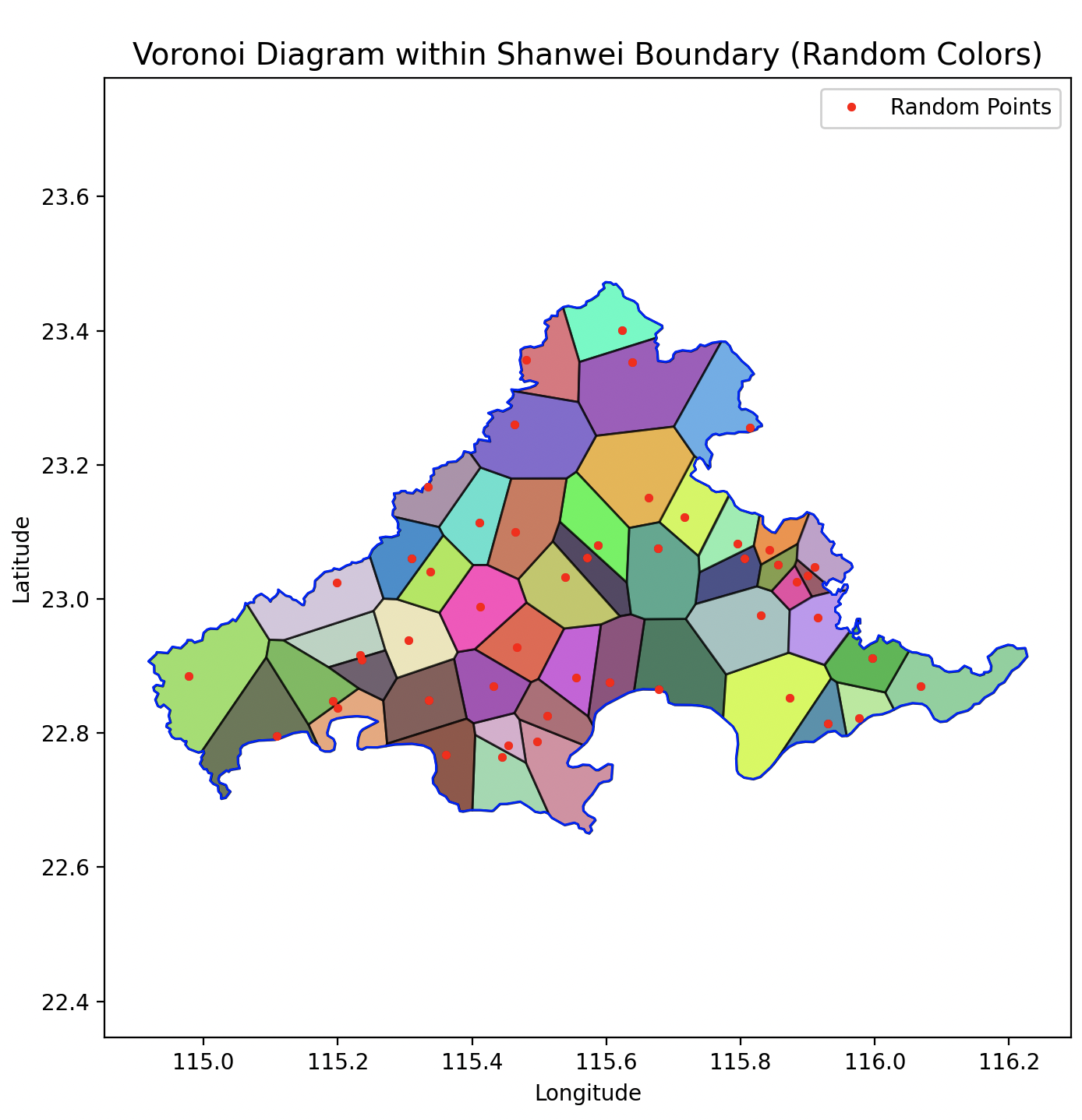 plt.title("Voronoi Diagram within Shanwei Boundary (Random Colors)", fontsize=14)