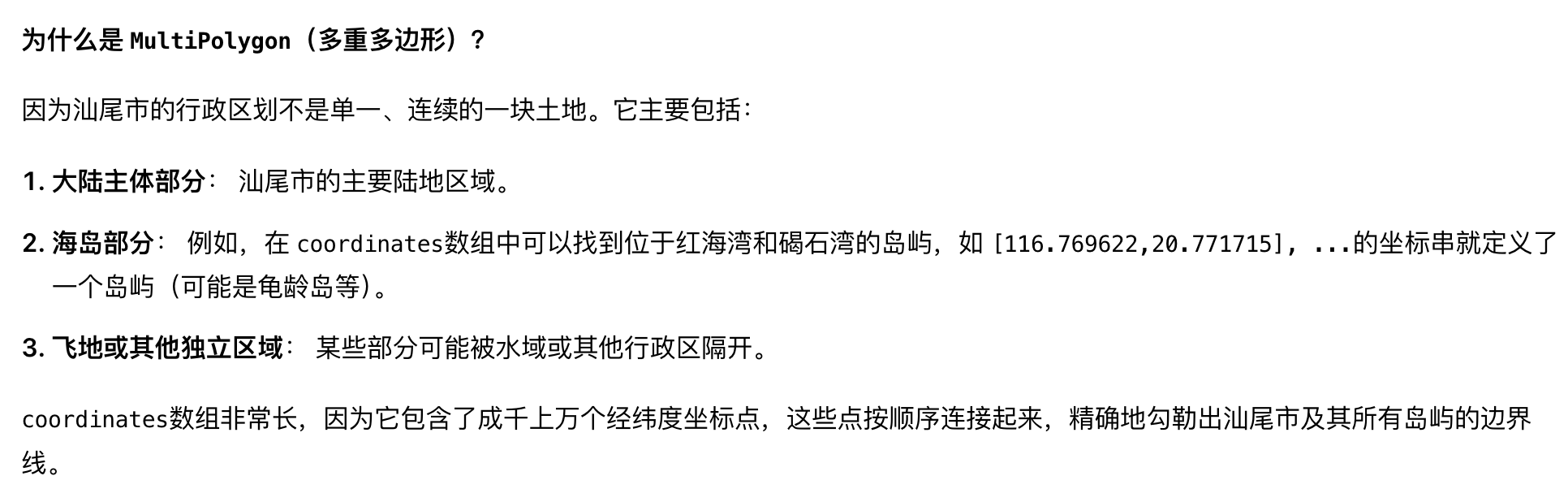 汕尾市的数据除了陆地上的主体,还有一些小岛屿,也包含在了json文件里,我实际上用的时候把岛屿的数据(也就是coordinates里面排在后面的几个数组)给删掉了。