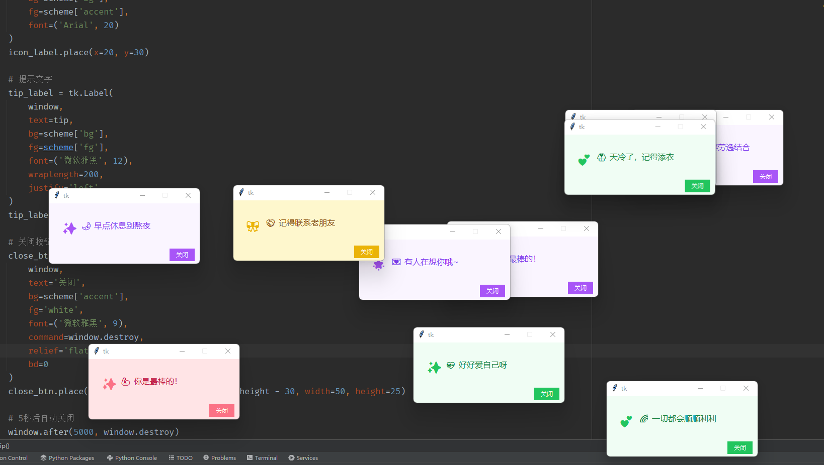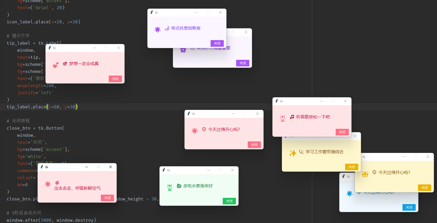 这个小小的Python程序展示了如何使用Tkinter创建美观实用的桌面应用。它不仅是一个温馨的提醒工具,也是学习Python GUI编程的好例子。你可以在此基础上继续扩展,比如添加设置界面、数据库支持、网络功能等,打造更加强大的个人助手应用。