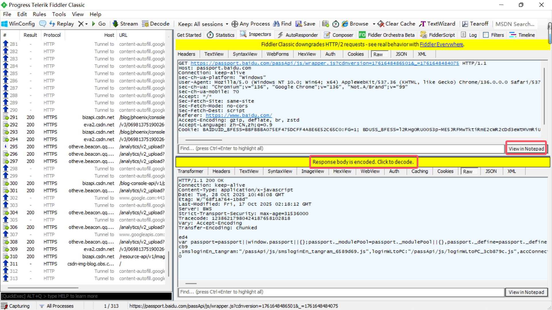 如果要在看的更清楚一点,可以用打开一个文本文档,点击"View in Notepad"即可。在响应中,有乱码的情况,那么点击这个"Response body is encoded。Click to decode"即可,响应也可以用同样的方式使用文本文档打开。