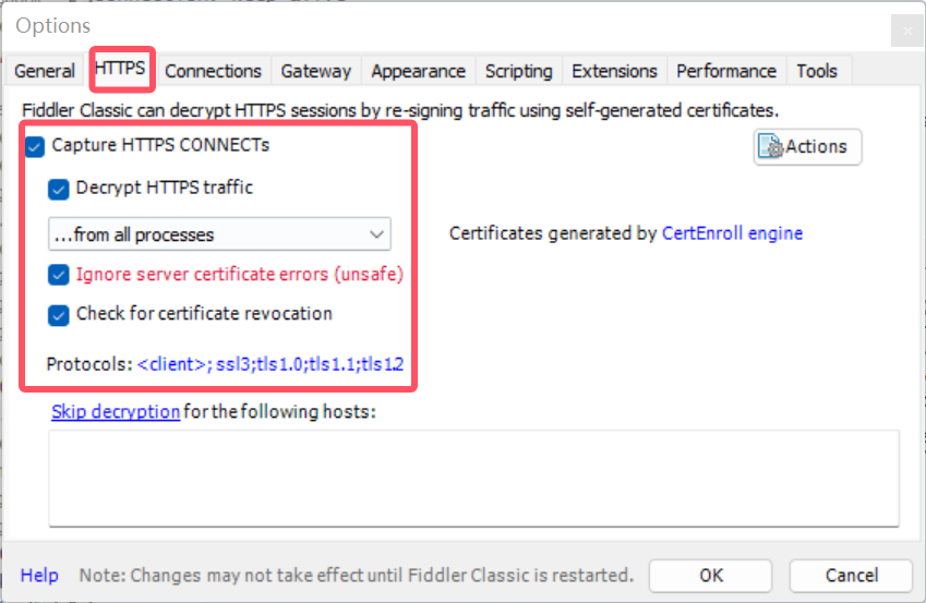 打开 fiddler 之后,点击 Tools -> Options,点击 HTTPS ,然后把这些都进行勾选就好了。要注意的是,如果有弹出是否接受 fiddler 证书这种弹框,一定要选 yes。不然就用不了了。