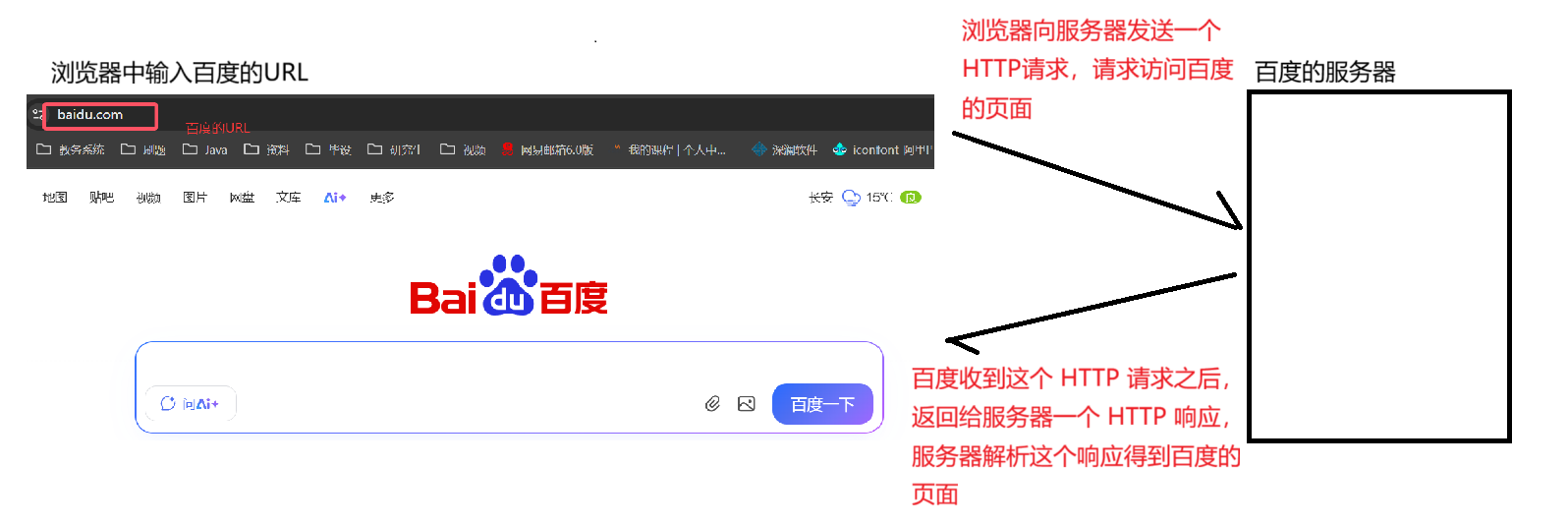 当我们再浏览器中输入一个百度的网址(也就是 URL)时,浏览器就会给百度的服务器发送一个 HTTP 请求,百度的服务器就会返回一个 HTTP 响应。这个响应被浏览器解析之后就会展现出我们看到的模样。
