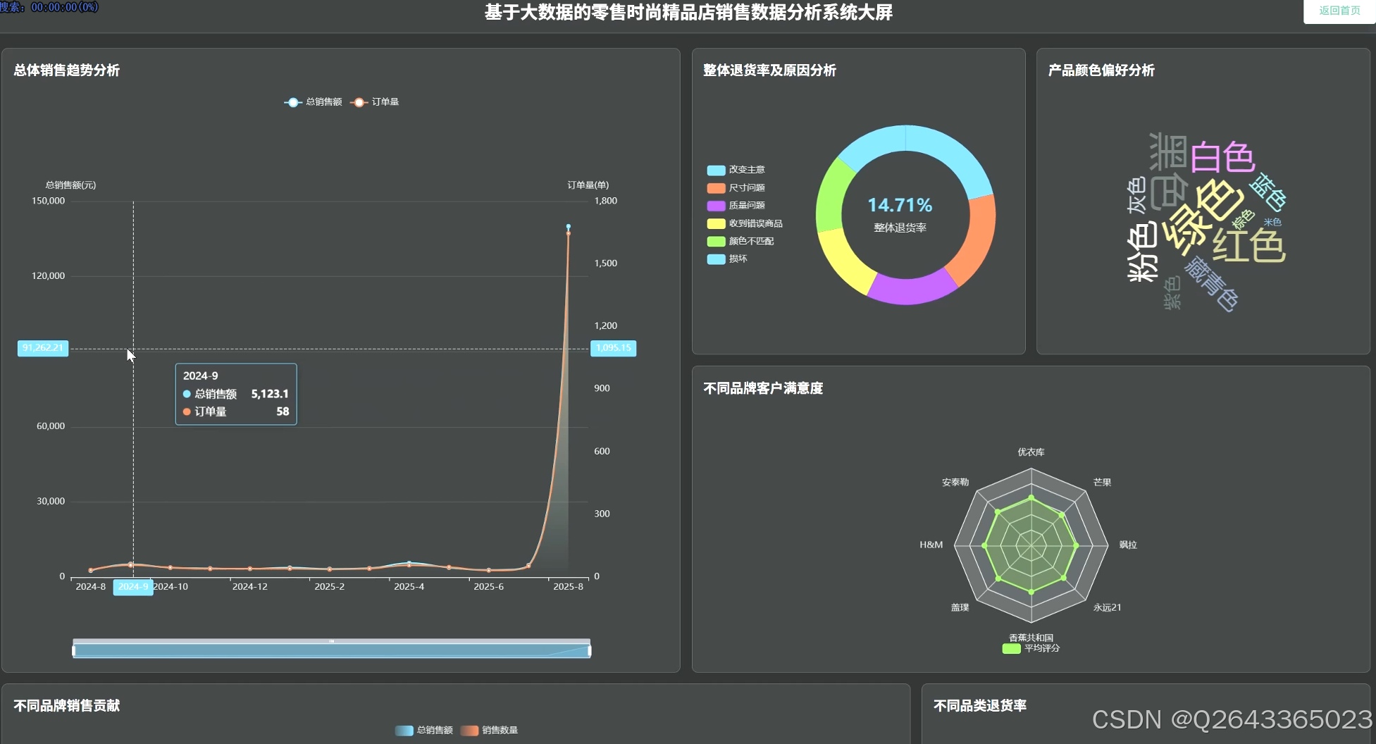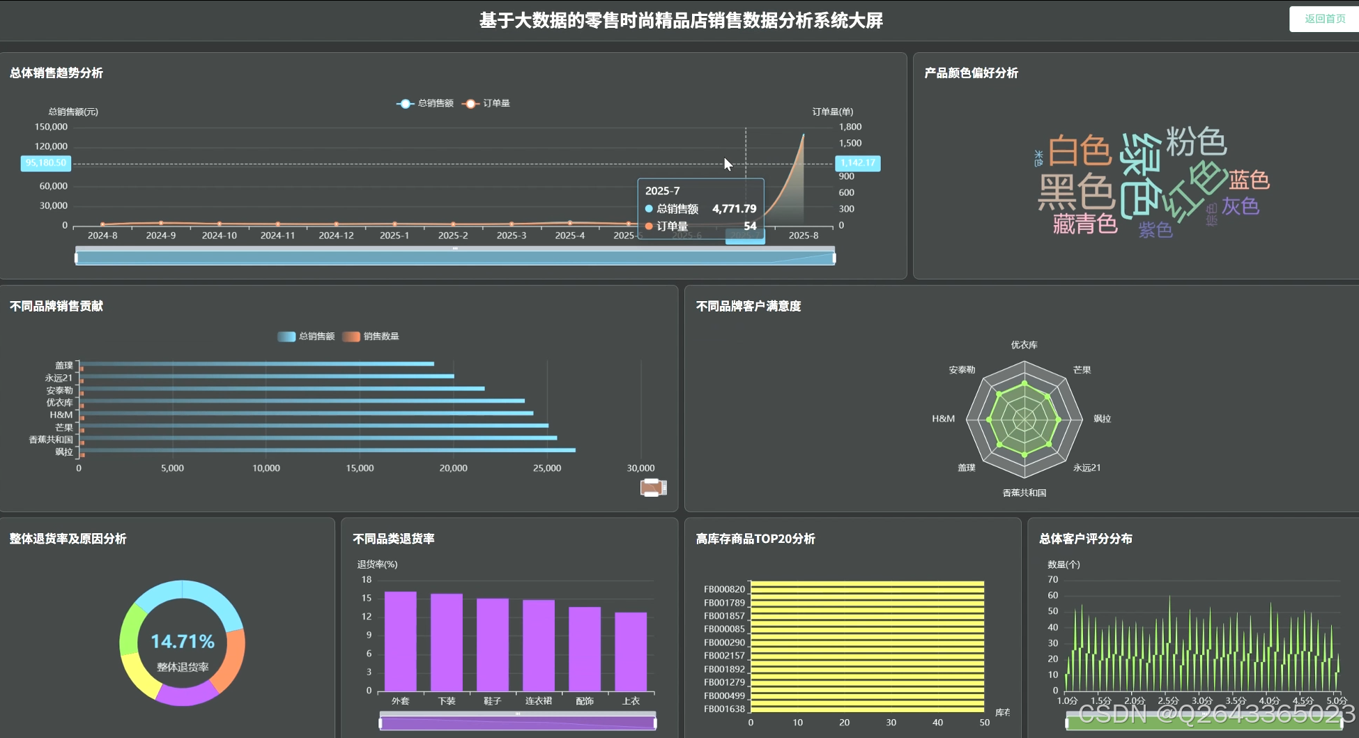数据可视化展示模块:此模块负责将上述所有分析维度的结果,通过ECharts图表进行直观呈现。系统将设计多个主题分析看板(如销售业绩看板、产品洞察看板等),并通过组合不同类型的图表,动态展示销售趋势、品类占比、品牌贡献、颜色偏好、退货原因构成等关键指标,最终将核心图表集成为一个综合性的数据驾驶舱(大屏)。