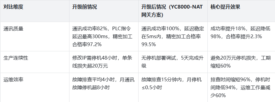 YC8000-NAT网关部署后,生产线跨网段通讯问题彻底解决,通讯稳定性、生产效率及维护成本等方面提升显著,具体对比如下: