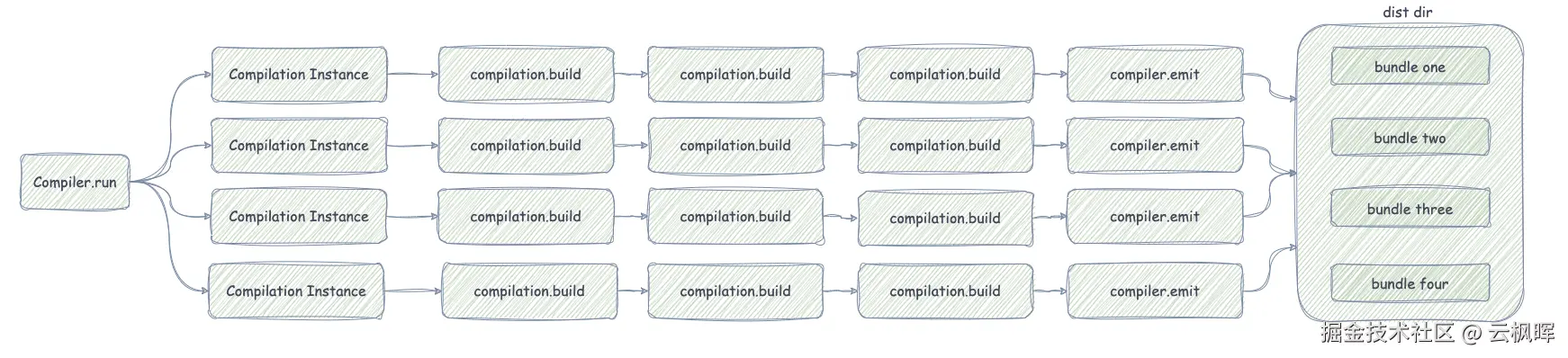 Webpack整个编译过程中只有一个Compiler实例 - Compilation 编译实例,代表一次资源构建,包含了当前模块资源、编译生成资源、变化的文件等信息。