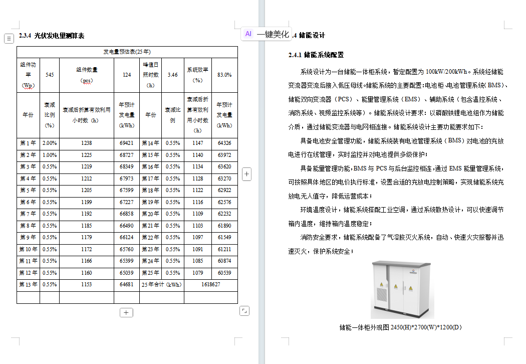 高系统效率:光伏组件采用单晶硅材料,在稳定效率下标称功率不低于540Wp,整体发电效率不低于82%。储能系统采用磷酸铁锂电芯,充放电效率不低于92%。