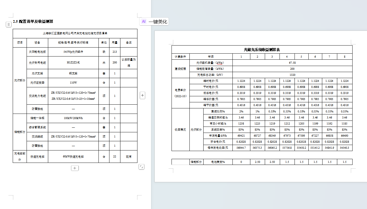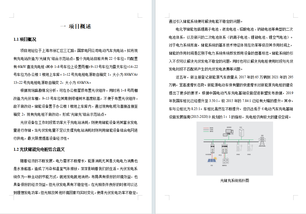 项目地址位于上海市徐汇区三汇路,国家电网公司电动汽车充电站。拟将现有充电站改造为'光储充'结合示范站点,整个充电站目前共有22个车位,均配置有60kW直流充电桩。其中1~8号车位上设置雨棚;9~13号车位为露天车位;14~22号车位为办公楼1楼地上车库。1~12号充电桩电源取自箱变1,大小为800kVA;13~22号充电桩电源取自箱变2,大小为630kVA。