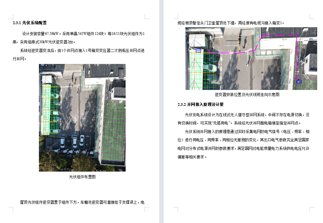 光伏组件分别布置于办公楼屋顶与车位雨棚顶部,均在已有资源上进行改造,不占用多余土地资源,可更加高效利用现有土地资源。