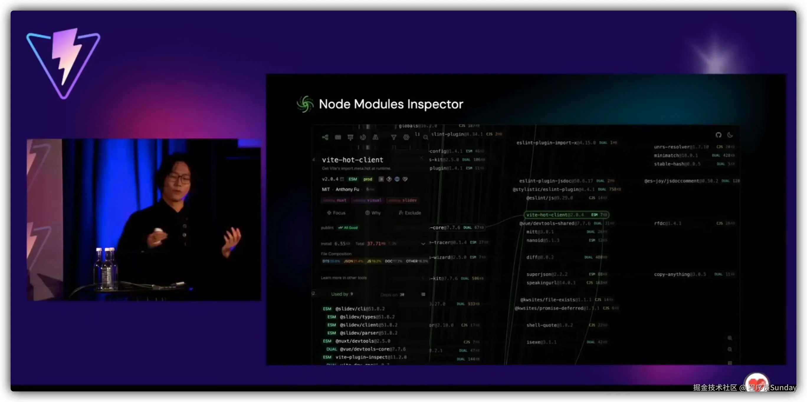 Vite 团队的核心成员 Anthony Fu 在大会现场做了一个 live demo:当他在浏览器中打开 DevTools 面板时,整个构建过程直接以可视化的方式呈现出来: